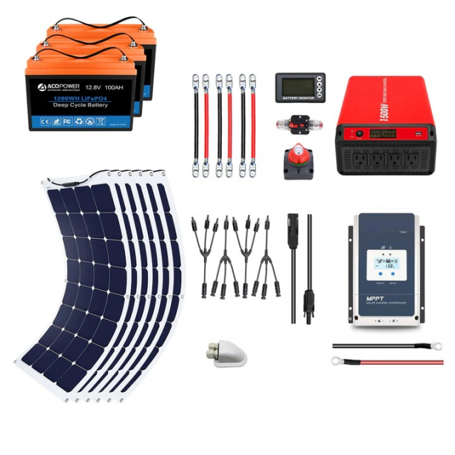 - Perfect 220W-660W Flexible Solar RV kit for having an off-grid 12 volt Lithium battery 12V Flexible Solar Panel system. 1500 Watt Pure Sine Wave Inverter provides plenty of AC power 120VAV to run your household appliances and the battery bank will supply plenty of energy for moderate use; Designed for RVs, cabins, homes, boats, fences, security cameras, greenhouse, camper, lawnmower, motorcycle, jet ski, trailer, camper, back-up and remote power use