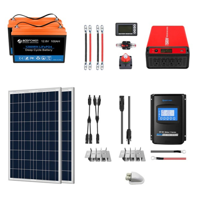 ACOPOWER, HYL200AH-P200W, Lithium Battery Poly Solar Power Complete System with Battery and Inverter for RV Boat 12V Off Grid Kit, Li200Ah 1.5kW, 200W MPPT30A