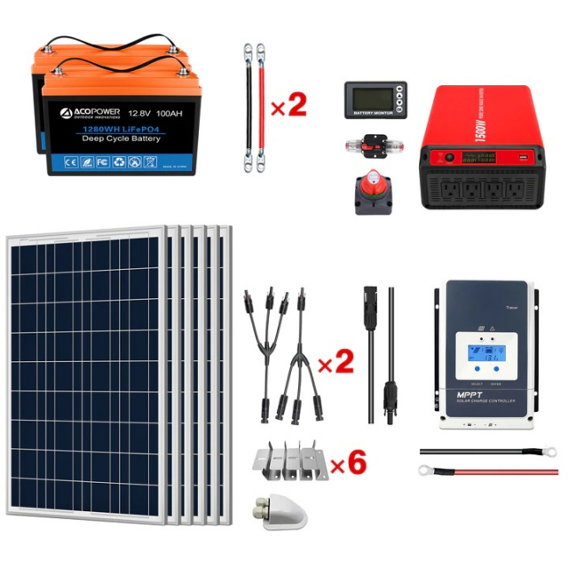 - One kit-everything you need DIY your solar charge system, the kit includes the necessary tools to start. Complete kit includes: 8 pcs 100 Watt Polycrystalline Solar Panel, 3 pcs 100Ah LiFePO4 Deep Cycle Lithium Battery with Built-in 100A BMS, 1500W DC to AC Power Inverter, 60 amp MPPT Solar Charge Controller (with LCD Display), a 60A fuse, a battery switch, a battery monitor, all necessary Cables, all necessary solar mounting Z brackets