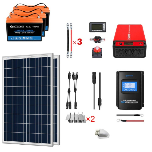 - One kit-everything you need DIY your solar charge system, the kit includes the necessary tools to start. Complete kit includes: 8 pcs 100 Watt Polycrystalline Solar Panel, 3 pcs 100Ah LiFePO4 Deep Cycle Lithium Battery with Built-in 100A BMS, 1500W DC to AC Power Inverter, 60 amp MPPT Solar Charge Controller (with LCD Display), a 60A fuse, a battery switch, a battery monitor, all necessary Cables, all necessary solar mounting Z brackets