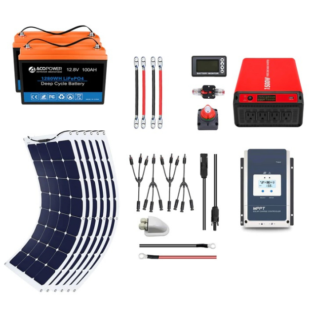 - Perfect 220W-660W Flexible Solar RV kit for having an off-grid 12 volt Lithium battery 12V Flexible Solar Panel system. 1500 Watt Pure Sine Wave Inverter provides plenty of AC power 120VAV to run your household appliances and the battery bank will supply plenty of energy for moderate use; Designed for RVs, cabins, homes, boats, fences, security cameras, greenhouse, camper, lawnmower, motorcycle, jet ski, trailer, camper, back-up and remote power use