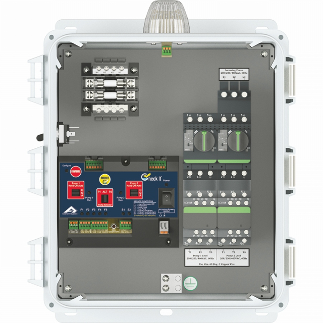 Alderon, 2010675, Check It™ CKIT3D460CO9-14+4AGHPS20 Three Phase Duplex, 208/230/460VAC, 9 - 14 Amps, Enclosure Size 14" x 12" x 6", (4) Altra Gold Control Switches, Normally Open, Stainless Steel Pipe Clamps, 20' Cable