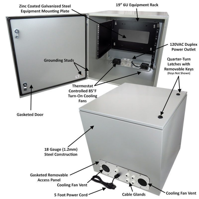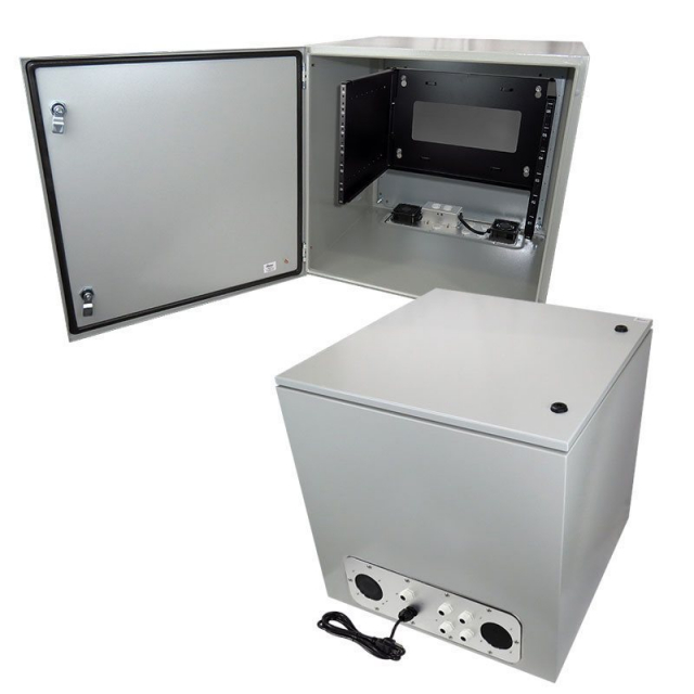 The Altelix NS242424VFA1R2C-85-R6U Steel Fan Cooled Weatherproof NEMA Enclosure with 120VAC Power and Equipment Plate is ideal for protecting rack-mountable equipment from harsh environments and tampering. Equipment designed for indoor use can now be located outside.