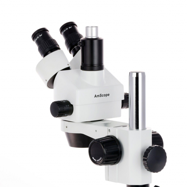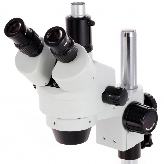 This is a trinocular stereo zoom microscope with a pillar-stand with extra-large base. It incorporates all the most excellent features of a high quality laboratory instrument. Designed to meet the demands of modern microscopy applications, this scope exceeds all expectations. It comes with SUPER widefield optics and super large stand. This microscope offers high resolution and good depth within a broad field of view. It provides crystal clear sharp stereo images with a 4" (100mm) native working distance. Its 45 degree inclined ocular tubes ensure an easy observation and rubber eyeguards provide further comfort.