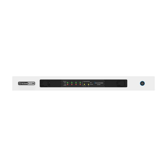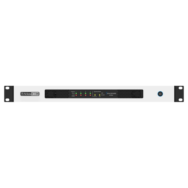 The AtlasIED Atmosphere AZA404 four-channel amplifier is designed to interface with the Atmosphere family of products, such as the AZM series of processors. The AZA amplifiers can be configured in pairs to deliver up to 100W per channel into both low and high-impedance speaker loads (4Ω/8Ω/70V/100V).