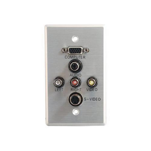 Add the finishing touch to audio/video installations with a decorative feed-through wall plate. This wall plate is stamped from sturdy 20 gauge stainless steel, and is designed to mount in standard electrical boxes or mud rings. The thick stainless steel composition provides better protection than plastic wall plates in commercial environments where constant wear and tear causes damage. Feed-through connectors and identification markings make this wall plate simple to install and easy to connect equipment. Furthermore, it is compatible with any existing wiring network. The single gang design offers connectors for HD15, 3.5mm stereo audio, composite video, left/right audio and s-video all in one wall plate. Feed-through connectors are designed to offer lossless signal transfer and maximum insertions for a lifetime of service. Mounting hardware included.