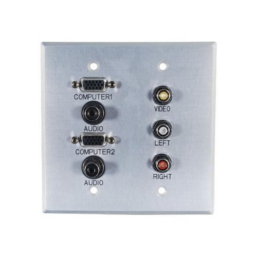 Add the finishing touch to audio/video installations with a decorative feed-through wall plate. This wall plate is stamped from sturdy 20 gauge stainless steel, and is designed to mount in standard electrical boxes or mud rings. The thick stainless steel composition provides better protection than plastic wall plates in commercial environments where constant wear and tear causes damage. Feed-through connectors and identification markings make this wall plate simple to install and easy to connect equipment. Furthermore, it is compatible with any existing wiring network. The double gang design offers connectors for two HD15, two 3.5mm stereo audio, composite video and left/right audio all in one wall plate. Feed-through connectors are designed to offer lossless signal transfer and maximum insertions for a lifetime of service.