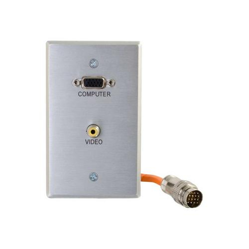 RapidRun is designed to be the standard for in-wall audio/video installations. Using pre-terminated Break-away flying leads and wall plates with an in-wall runner ensures flexible, efficient, high quality connections for all types of equipment, with no field terminations. Constructed from aluminum for durability, this wall plate has a locking connector that enables the integrator to save valuable space inside the surface mount or electrical box that typically is already packed with cables. Ideal for educational and institutional installations, this wall plate sends VGA and Composite Video over a single Multi-Format runner cable. It is commonly used on the teacher's station (computer) end of classroom setups with the corresponding flying lead used at the projector.