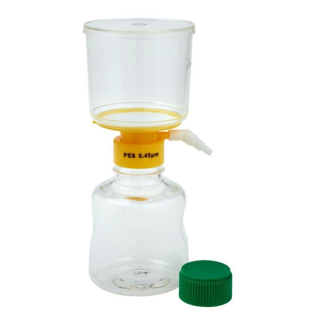 Vacuum filter systems can be used for large volume separation and purification. CELLTREAT® bottle top filtration systems are manufactured in a Class 100,000 clean room from USP class VI virgin polystyrene. They utilize a polyethersulfone (PES) membrane material in 0.22ìm or 0.45ìm pore sizes for rapid flow rate and low protein bonding. Gamma irradiation sterilized and non-pyrogenic.