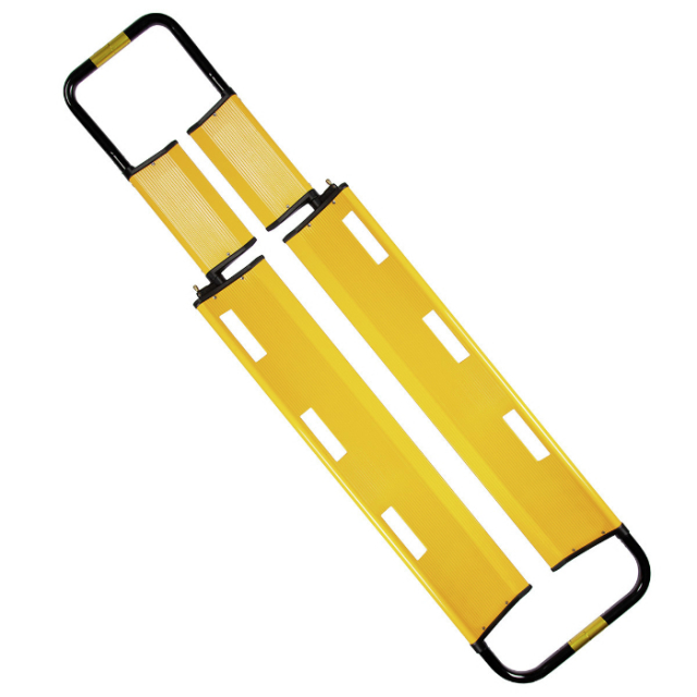 Stretcher Scoop is made of lightweight aluminum. It is adjustable in length, containing 3 patient restraint straps. The load limit is 350lb.