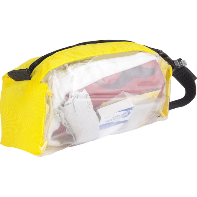 AED Support Kit includes supplies for defibrillation stored in a plastic bag or yellow pouch with buckle.