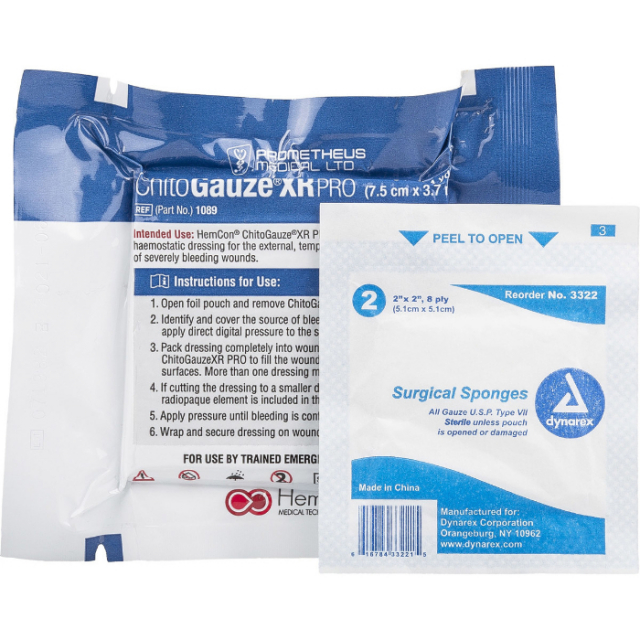 This bagged kit includes a 2"x2" gauze pad, as well as the Prometheus ChitoGauze® XR Pro hemostatic dressing. The Chitogauze® is impregnated with Chitosan, to control traumatic hemorrhaging.