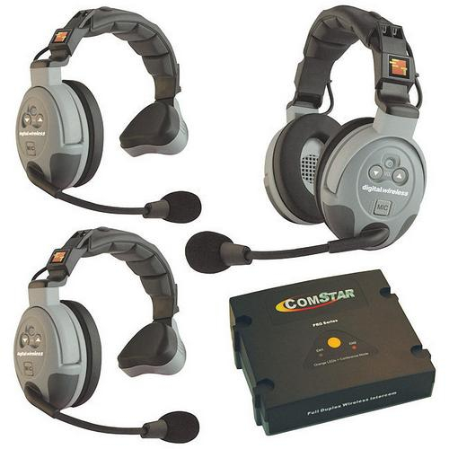 At the heart of each COMSTAR® system is a signal relay called the Com-Center. This centralized base transceiver is both AC powered or battery powered for on-location use and is totally portable. Each Com-Center can accommodate up to eight users in full-duplex. Choose any combination of wireless headsets to create a completely customized system.