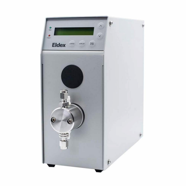 Optos precision, high-pressure metering pump. This "Plus" model features an integrated pulse damper/pressure transducer that reduces flow pulsation and allows for pressure monitoring capabilities.