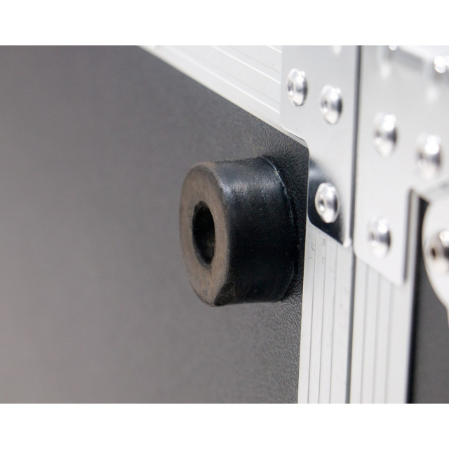 OSP rubber foot for ATA flight cases & racks. Heavy-duty, slip-resistant build with steel core insert, can be used for other furniture builds as feasible. 1.5" rubber diameter, 3/4" height, 8mm opening for mounting screw or bolt.