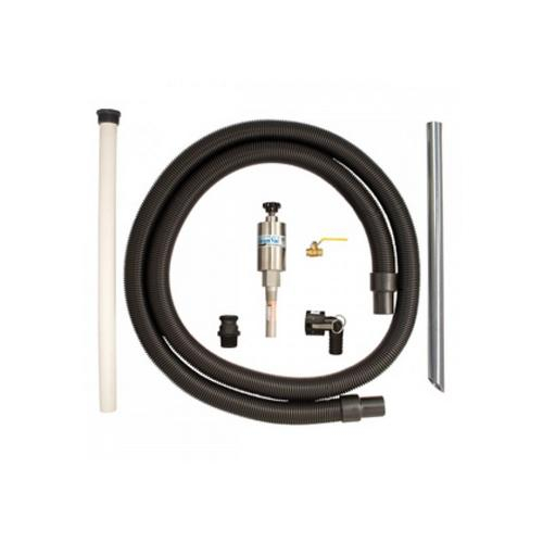 EXAIR's compressed air operated Reversible Drum Vac System attaches quickly to any closed head 30, 55 or 110 gallon drum. Its compressed air powered vacuum fills a 55 gallon drum in less than two minutes. With the simple turn of a knob, the same stainless steel pump quickly empties the drum. The Reversible Drum Vac does not use electricity and has no moving parts, assuring maintenance free operation. An automatic safety shutoff valve prevents spills or overfilling. Drum Vac Systems include the two-way pump assembly (1/4 NPT), shutoff valve, 10' (3m) flexible vacuum hose (1-1/2"/38mm I.D.) with 90° quick release elbow connection and (1) aluminum wand.