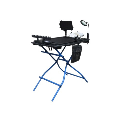 The heavy-duty, steel legs lock firmly to the work surface and stand at 31-1/2 inches tall and unique Cable Management Bracket fits securely on either side of the workbench. Separate the work surface from the stand and quickly attach the two unique stand-off props with adjustable webbing and you can take your work table to heights. Attach the Aerial Strand Cables and your table is right where you need it for working from an aerial bucket truck.