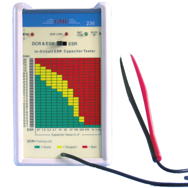 Model 236 In-circuit ESR and DCR capacitor tester is designed to measure ESR (equivalent Series Resistance) on capacitors range from 0.47µF to 2200µF, in or out of circuit. The ability to troubleshoot in-circuit saves time, making the 236 a must for anyone that tests or trouble- shoots PCB (printed circuit boards). 100 kHz output test frequency and using a low 15 mVp-p output test voltage that will not turn on any solid state devices during testing for accurate test result. Model 236 is microprocessor controlled and automatically discharge capacitor under test.