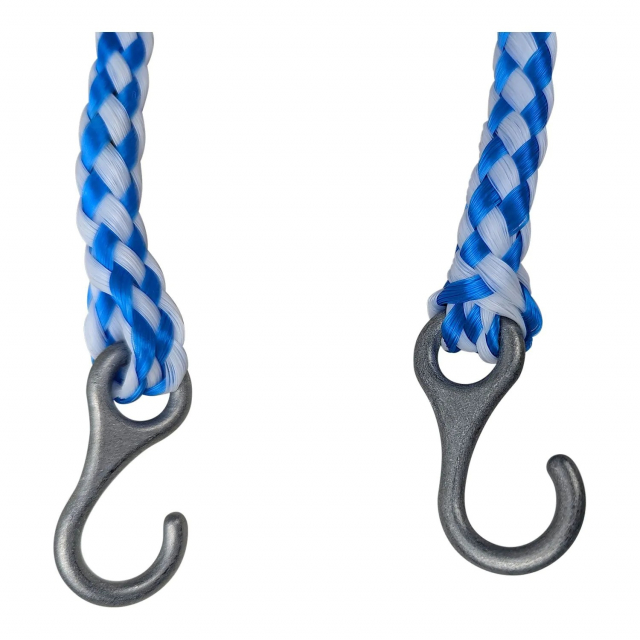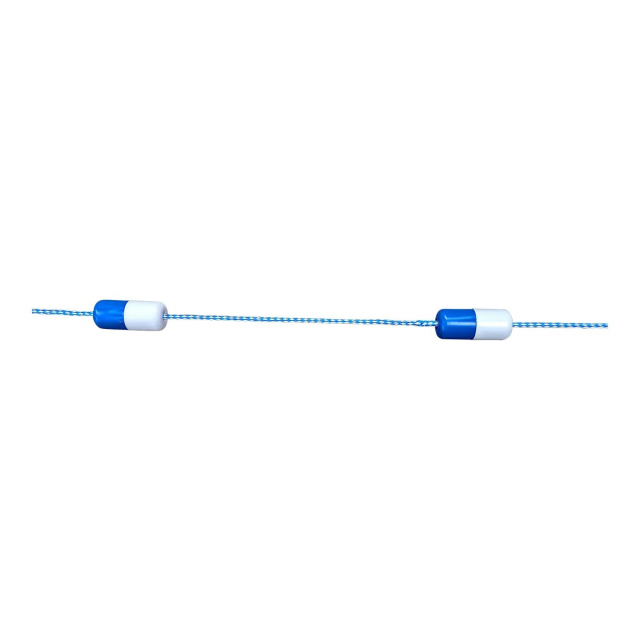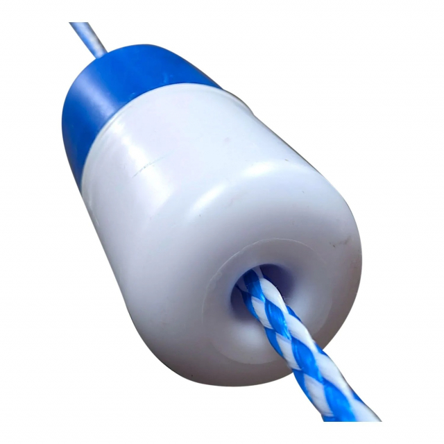 Kemp USA Pool divider rope and float kit, features a 3/4-inch royal blue / white rope complemented by 3x5" blue/white floats and rust-resistant metal hooks on the ends. All constructed from durable polypropylene rope. Requires no assembly, making it convenient for immediate use.