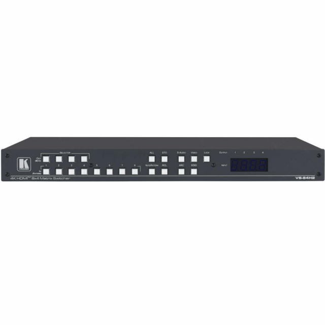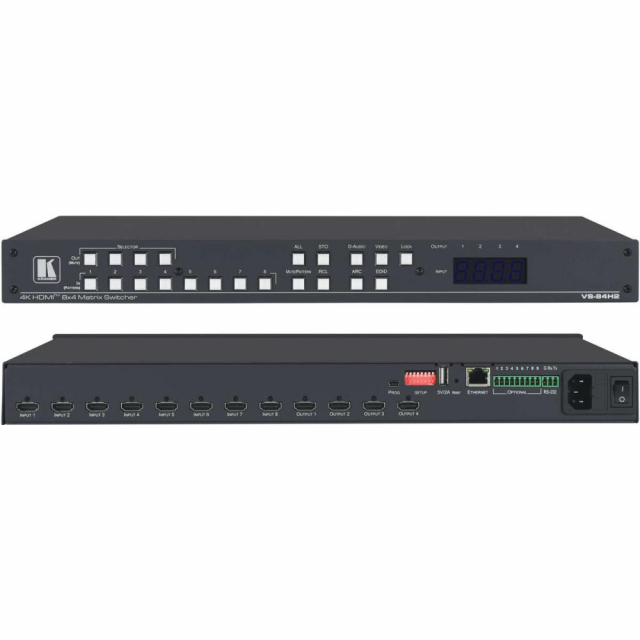 VS-84H2 is a high-performance 8x4 matrix switcher for 4K at60Hz (4:4:4) HDR signals and digital audio routing. It reclocks and equalizes the signals and can route any one of 8 HDMI, HDCP-compliant sources (selectable) to any or all outputs simultaneously. VS-84H2 offers unmatched audio flexibility where any embedded digital audio input can be routed to any digital output in addition to four ARC sources to produce an equivalent 12x8 audio matrix.