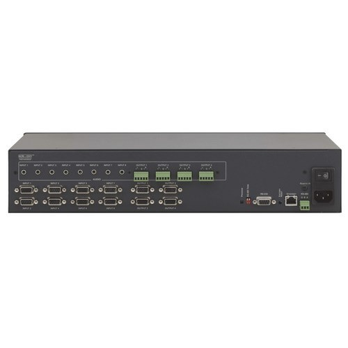 The VP-8x4AK is a high-performance matrix switcher for computer graphics video signals, with resolutions up to and exceeding UXGA, and unbalanced stereo audio signals. The unit can route any combination of Inputs and Outputs and converts the audio to balanced stereo audio Outputs.