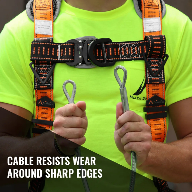 The 5K Wire Rope Sling - 6ft is an ANSI Z359 certified anchorage connector with iridescent blue tubing for easier cable inspections. This wire rope sling can be used in a basket configuration. Cable slings are excellent temporary and semi-permanent ANSI-certified anchors. Malta Dynamics has the best wire rope slings for sale. They are 6" lengths with various terminations for versatility on the job or in a rescue kit.