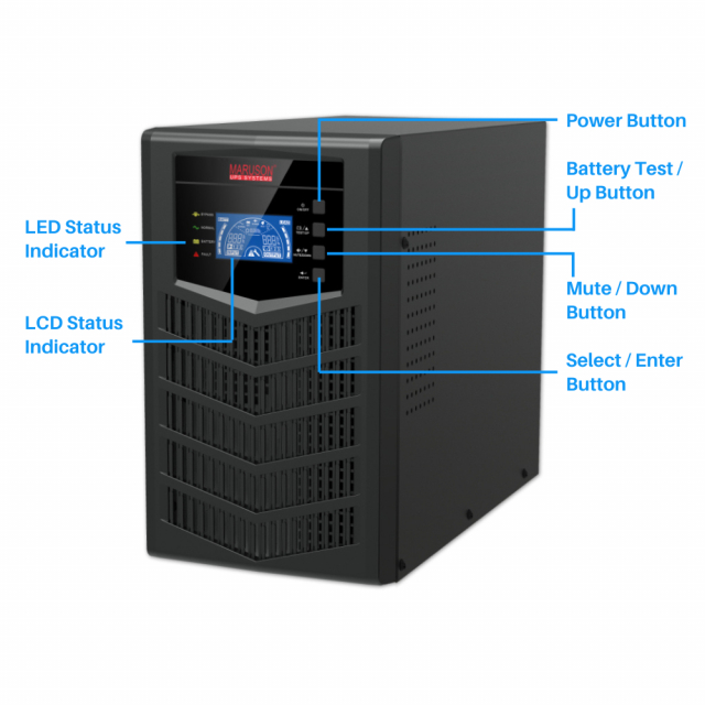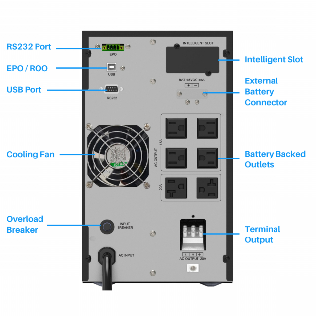 The main supply is fed directly into the UPS and charges batteries within the UPS. The battery power is then converted back to the main power to feed the protected equipment. The isolation of input power from output power protects equipment from fluctuations, surges, and noise before reaching connected equipment delivers consistent, high-quality AC power.