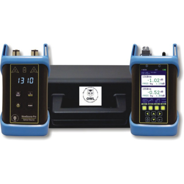 Many fiber optic network bids and Requests For Quote (RFQ) are citing cabling standards to specify the set of guidelines (such as fiber length) that the network installer must follow during the network installation. Adherence to such standards is meant to ensure the quality of the installation and guarantee that the network will perform as it was designed. The process of testing a network installation to ensure its adherence to specified standards is called certification, and often requires hard-copy documentation as proof of adherence to standards. The Fiber OWL 7V SM/VFL Test Kit contains the tools necessary for certifying fiber optic links against a myriad of popular cabling standards in singlemode networks, commonly referred to in the industry as Tier 1 certification. The Fiber OWL 7V (p/n: F7V) optical power meter is multimode and singlemode ready, and contains a user-friendly Fiber Link Wizard with color diagrams to guide the setup process, calculate the link budget, and set the optical reference. Up to 10,000 fiber runs may be stored in internal memory, and can be downloaded to a PC for report generation with OWLView software. Intelligent automated testing functions include automatic dualwavelength storage and auto-wavelength recognition which reduce testing time and human error. The universal detector port on the F7V comes with 2 adapter caps, one for 2.5mm connectors such as SC, ST, and FC, and the other for 1.25mm connectors such as LC. The length testing port and visual fault locator are LC. The WaveSource Pro SM/VFL (p/n: WPSV) fiber optic light source is designed for accurate testing and certification of singlemode (1310nm & 1550nm) networks. Its dual-wavelength outputs are temperature-stabilized for accurate measurements. The WPSV has a built-in auto-wavelength switching protocol designed to synchronize the wavelength of the F7V with the current output wavelength, and its integrated VFLport allows for easy visual fault location and visual fiber identification. The light source comes configured with SC connector ports.