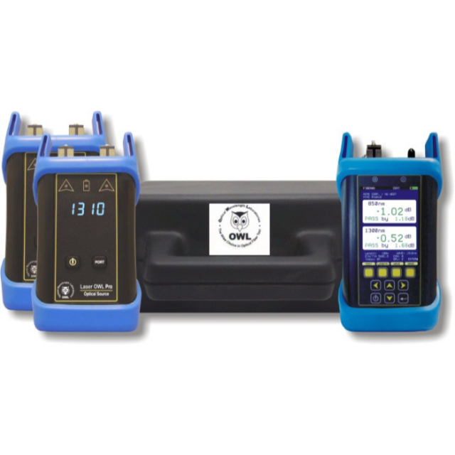 Many fiber optic network bids and Requests For Quote (RFQ) are citing cabling standards to specify the set of guidelines (such as fiber length) that the network installer must follow during the network installation. Adherence to such standards is meant to ensure the quality of the installation and guarantee that the network will perform as it was designed. The process of testing a network installation to ensure its adherence to specified standards is called certification, and often requires hard-copy documentation as proof of adherence to standards. The Fiber OWL 7X Dual OWL / Laser OWL Test Kit contains the tools necessary for certifying fiber optic links against a myriad of popular cabling standards in singlemode and multimode networks, commonly referred to in the industry as Tier 1 certification. The Fiber OWL 7X (p/n: F7X) optical power meter is multimode and singlemode ready, and contains a user-friendly Fiber Link Wizard with color diagrams to guide the setup process, calculate the link budget, and set the optical reference. Up to 10,000 fiber runs may be stored in internal memory, and can be downloaded to a PC for report generation with OWLView software. The universal detector port on the F7X comes with 2 adapter caps, one for 2.5mm connectors such as SC, ST, and FC, and the other for 1.25mm connectors such as LC. The length testing port is SC. The Dual OWL Pro (p/n: DP83) and Laser OWL Pro (p/n:LP35) fiber optic light sources are designed for accurate testing and certification of multimode and singlemode networks. The light source outputs are temperature-stabilized for accurate measurements. These sources come configured with SC connector ports.