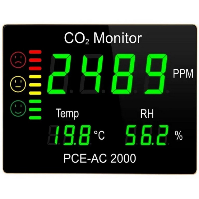 Thermometer as a large display / with bar graph / maintenance-free CO2 sensor / additionally with CO2 and humidity display / measuring range up to 9999 ppm for e.g. training rooms, public facilities