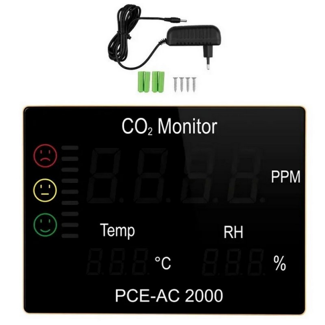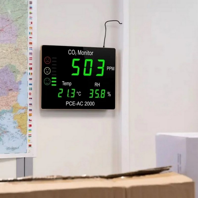 The innovatively designed thermometer is a large display for monitoring the indoor air quality. This CO2 measuring device is used specifically to monitor indoor air quality in large rooms. These include, for example, meeting rooms, lounges or public spaces such as classrooms and kindergartens. Due to the large size of 388 x 288 x 43 mm, the CO2 indicator can also be easily read from a greater distance. With the wall bracket for the CO2 indicator, the large display can also be mounted anywhere on walls.