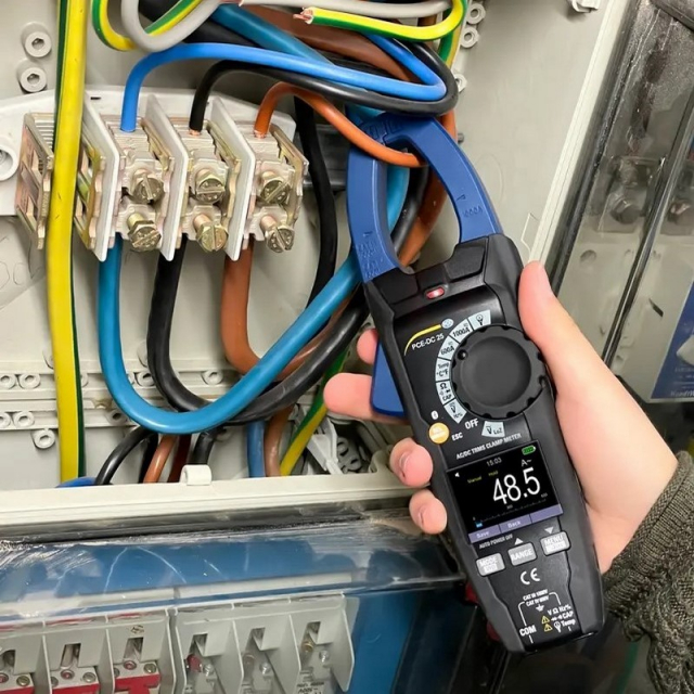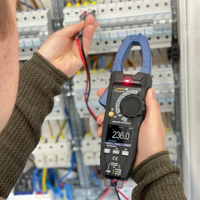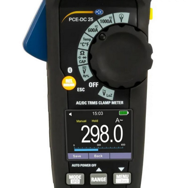 Voltmeter with Bluetooth interface / Current measurement 0 - 1000 A AC/DC / Temperature measurement / NCV test / Clamp opening 34 mm (1.3") / Measuring rate of 3 Hz / Optionally expandable with Rogowski coil for 3000 A AC / Automatic switch-off.