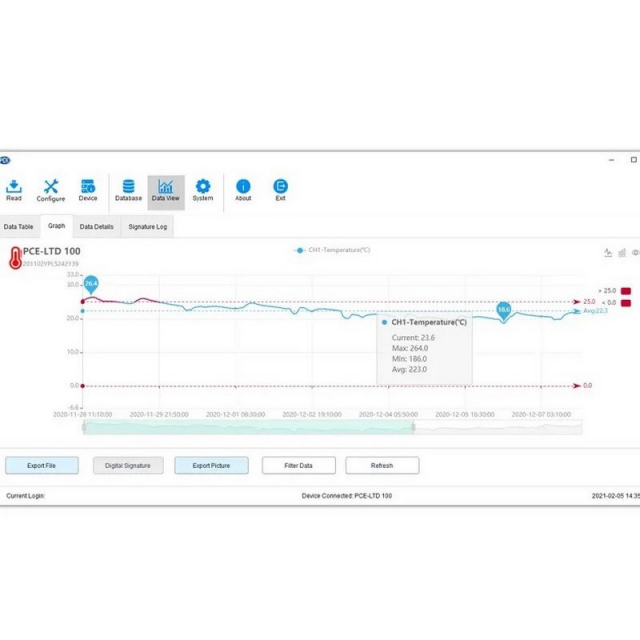 In order to read out the measurement data, the thermometer must be connected to a PC. From there, the thermometer is recognized as a mass data storage device. The software can now read out the thermometer in order to analyze the measurement data. The measurement data recorded by the thermometer can be exported as XLS, CSV, PDF, TXT and CIN for further processing. The graphic can also be exported as a JPG. At the same time, the thermometer can be set via the software. Among other things, the operator sets the start time, storage interval, the unit and the alarm limits. The thermometer can also be set so that it automatically outputs an exported file of the measurement data. The file formats PDF, DLG, CSV, XLS and TXT are available for selection. This has the particular advantage that the measurement data can be imported directly into a data management system.