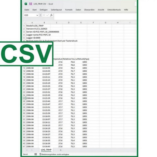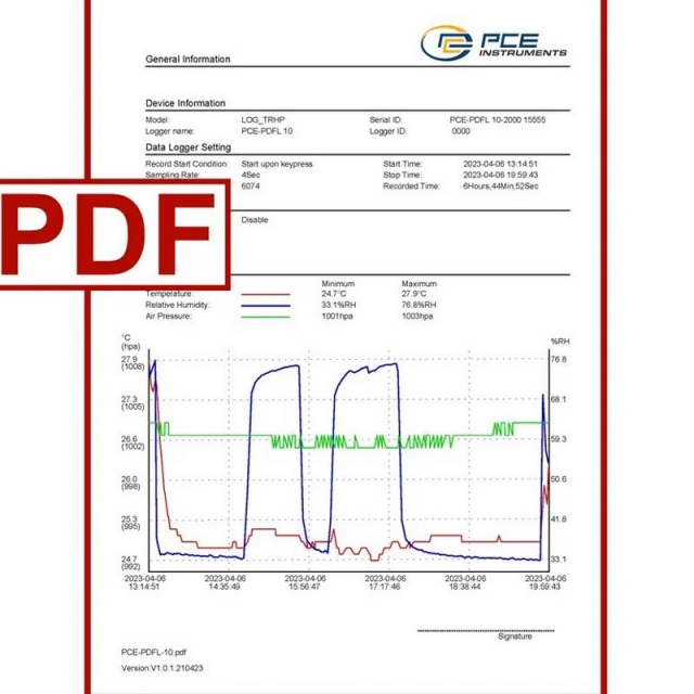 The measured values are stored on the internal memory of the thermometer. The thermometer has a memory capacity of 13340 measuring points. Once a measurement run has been completed, the stored measurement data can be read out from the thermometer independently of the operating system. This is possible because the thermometer is recognised as a mass data memory. When storing the measurement data, the measurement points are saved in a .pdf and in a .csv file.