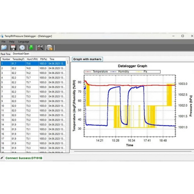 With the corresponding software for the thermometer, the measured values can be displayed graphically. In addition, settings for the thermometer can be made via the software. For example, the storage interval can be set between 1 minute and 24 hours, visual alarm limits and start/stop pulses can be set for the thermometer. Optionally, the thermometer can be equipped with an ISO calibration certificate.