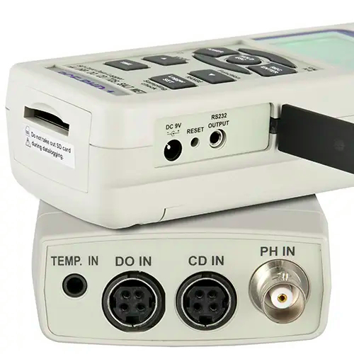 This pH Meter is a portable, easy-to-use measuring device with multiple capabilities for inspecting water quality. Offering extraordinary precision at an affordable price, the Multifunction pH Meter is used for laboratory and in situ testing of the pH value, redox, conductivity, salt content, oxygen level and temperature of water. Three-point calibration and automatic temperature compensation guarantee a high level of accuracy even with variable temperature measurements.