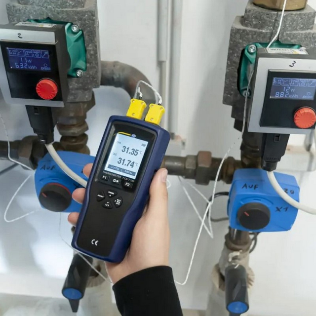 The digital thermometer has two measuring inputs. Each measuring input from the thermometer can be connected to a thermocouple of type K, T and J. With a measuring rate of 2 Hz, the thermometer shows rapid temperature fluctuations. With the high accuracy and a resolution of 0.01 °C, these rapid temperature fluctuations can also be displayed precisely by the thermometer.