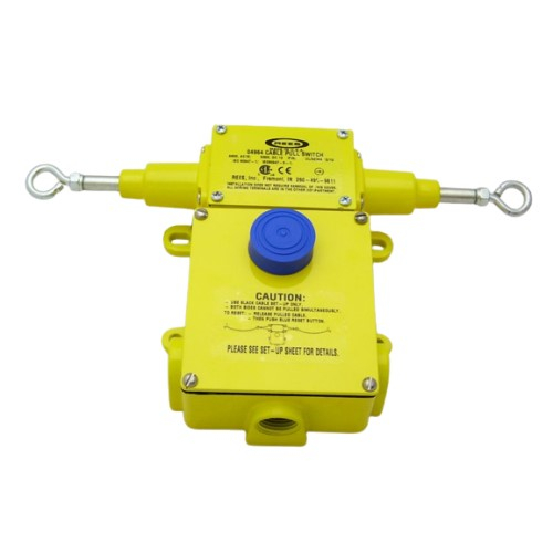The following"slack cable" style, bi-directional switch 2 NO and 2 NC contacts. The housing is made from high quality die-cast aluminum and powder coat painted yellow. The covers are made from aluminum and also powder coat painted yellow. This switch is activated by pulling the cable on either side. The switch can only be activated by pulling on the cable one side at a time (not simultaneously). Pushing the blue reset button on the switch cover will reset the contacts.