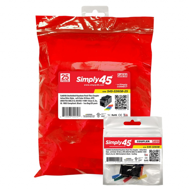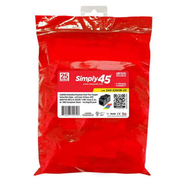 Simply45, S45-3260B-25, Cat6 Unshielded Keystone Feed-Thru Coupler, Black