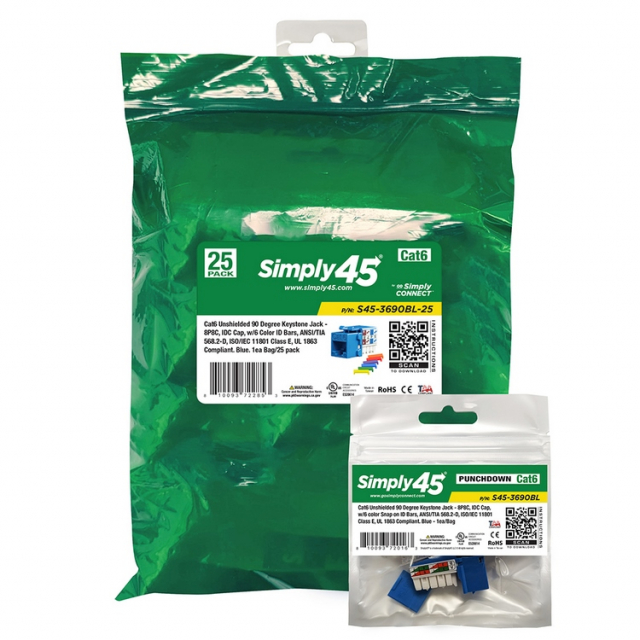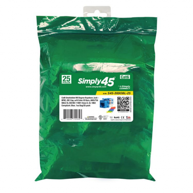 Simply45, S45-3690BL-25, Cat6 Unshielded 90 Degree Keystone Jack, Blue