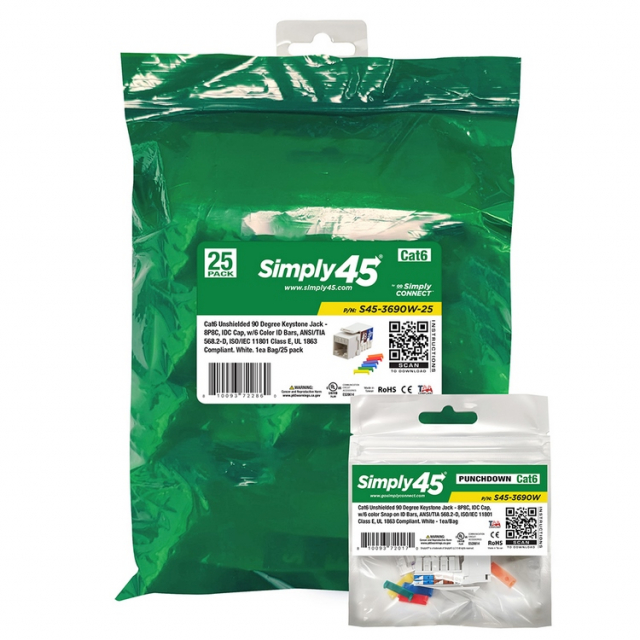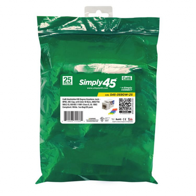Simply45, S45-3690W-25, Cat6 Unshielded 90 Degree Keystone Jack, White