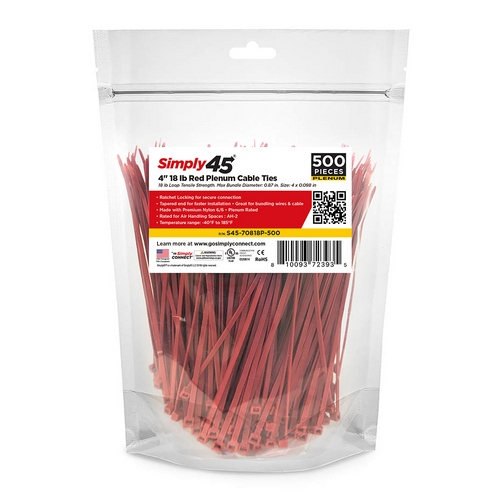 Simply45, S45-70418P-500, 4" 18lb UV Red Plenum Cable Ties - 500pc Bag