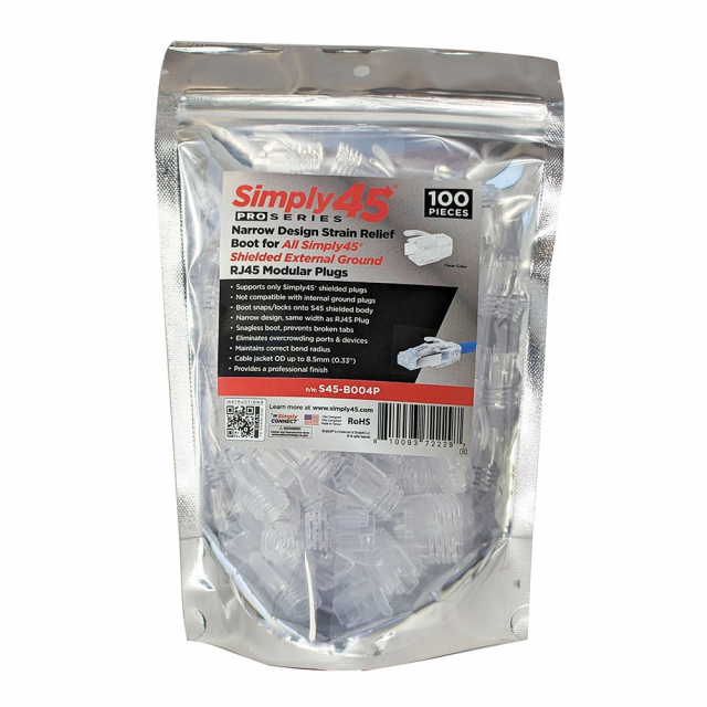 The Simply45® S45-B004P is an 8.5mm (0.33") Snagless narrow-width strain relief for use with larger diameter shielded LAN cables. The S45-B004P is recommended for all Simply45® PROSeries branded shielded with external ground RJ45 modular plugs. These 8.5mm strain reliefs protect the RJ45 modular plug and extend the useful life of the termination. Simply45® recommends that strain reliefs or boots should be used with all RJ45 terminations.