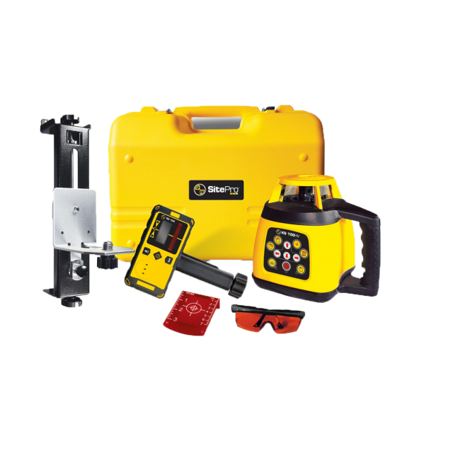Keep it simple with the KS 100HV horizontal and vertical electronic self-leveling rotary laser for precise leveling applications, Ideal for indoor and outdoor use: leveling, checking elevations, concrete forms, footings, foundations; estimating cut and fill; manual slope; installation of decks, pools, partitions and walls; drop ceilings, floors; excavating, digging footings, septic systems. Simple button operation, easy to use. Enclosed Rotor Housing keeps laser safe from tough jobsite conditions.