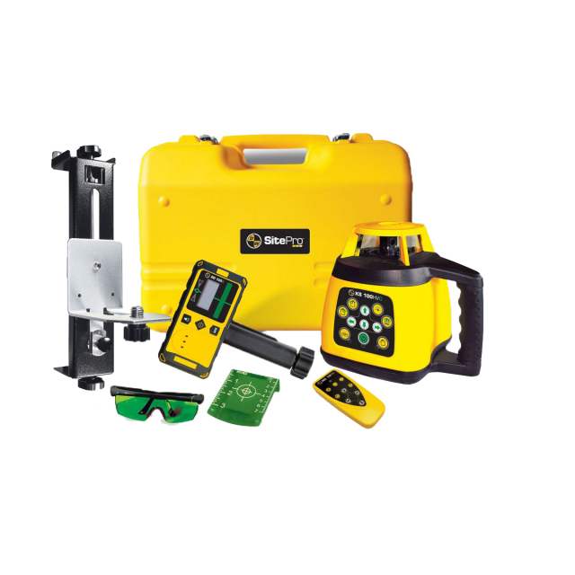 Keep it simple with the KS 100HVG green beam horizontal and vertical electronic self-leveling rotary laser for precise leveling applications, Ideal for indoor and outdoor use: leveling, checking elevations, concrete forms, footings, foundations; estimating cut and fill; manual slope; installation of decks, pools, partitions and walls; drop ceilings, floors; excavating, digging footings, septic systems. Simple button operation, easy to use. Enclosed Rotor Housing keeps laser safe from tough jobsite conditions.