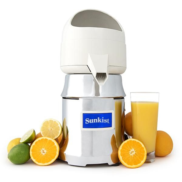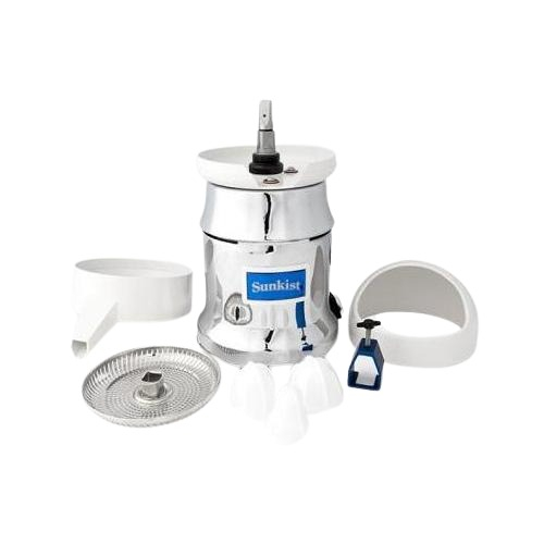 The Sunkist Commercial Juicer has a quiet, heavy-duty, high-torque motor that efficiently extracts the maximum amount of juice from the pulp, with a 20 gallon-per-hour capacity. This citrus juicer comes with three interchangeable extracting bulbs for oranges, lemons/limes, and grapefruits. The juicer's plastic dome, spout, and support bowl are all removable and dishwasher safe.