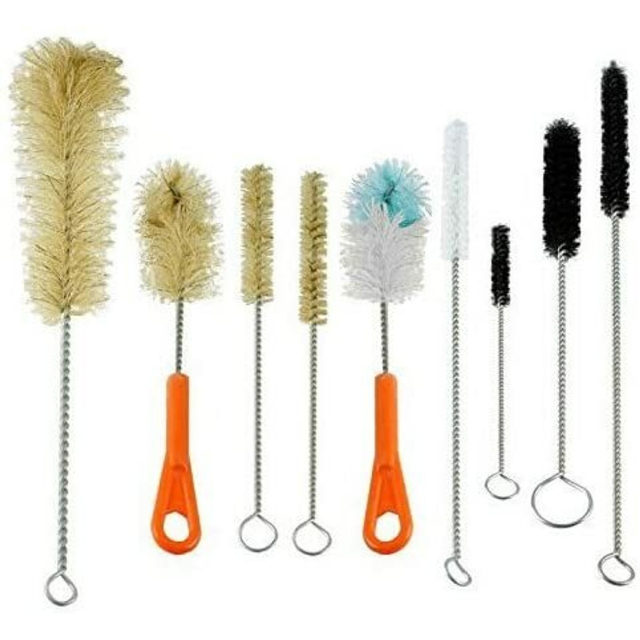 This lab glassware cleaning brushes are made of polypropylene. Use this cleaning brush set to scrape the inner walls of ybeakers, funnels, test tubes, and various other pieces of laboratory equipment and glassware. 9 brushes - each one unique size and shape for hard-to-clean bottles, dispensers & more. Flexible wound-wire handles conform to odd shapes, galvanized steel for rust resistance.