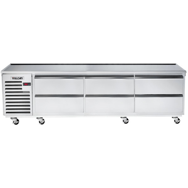 Make the most of your cooking line by adding this Vulcan ARS96 96" self-contained refrigerated chef base to your kitchen! This base has six drawers and can hold up to a total of (12) 12" x 20" x 6" pans of ingredients close at hand. By keeping ingredients nearby but still refrigerated, you can prevent additional trips back and forth to the refrigerator while still protecting your food from time and temperature abuse.