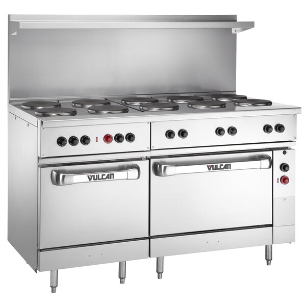 Cook pan after pan of your signature entrees, side dishes, and appetizers with this Vulcan EV60SS-10FP208 Endurance series 60" electric range with 10 french plates and 2 ovens! Thanks to the ten 9 1/2" diameter french plates, your chef can cook ten stock pots or fry pans full of product at the same time. Each smooth, 2 kW heating area is made of durable cast iron to help retain heat, while also making it much easier to clean than traditional ranges with coil-style burners. Infinite heat controls provide the operator with precise temperature control to accommodate the various cooking temperatures of different foods.