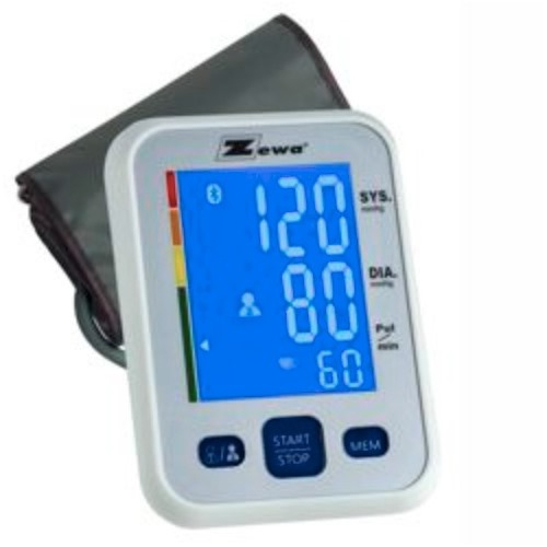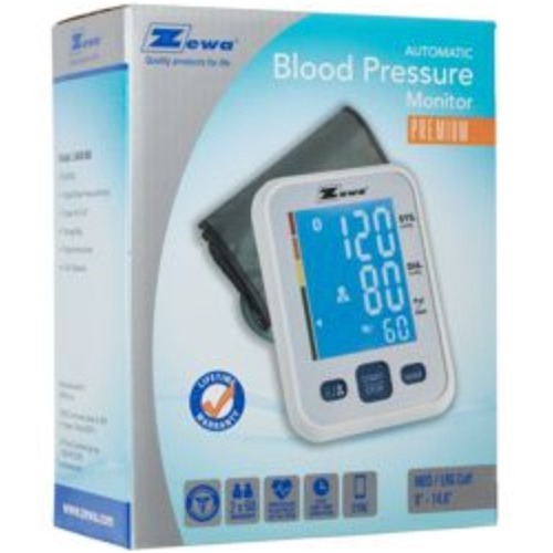 Zewa Medical's "Premium" Upper Arm Blood Pressure Monitor features a Large Easy-to-Read Screen with backlight, stores readings for 2 users (2 x 60). Includes cuff X-Large cuff that accommodates patients with arm sizes 13.4 to 18.9 inches. Additional features include a full color Easy-to-Read blood pressure scale (green, Yellow, Red), Irregular Heartbeat Indicator, and Date, Time function. It measures on inflation resulting in faster, more comfortable measurements. This next generation wireless blood pressure monitor offers the convenience of storing readings on a Smart Phone or Tablet utilizing MyHealthConnected App for Android or iOS Mobile devices.